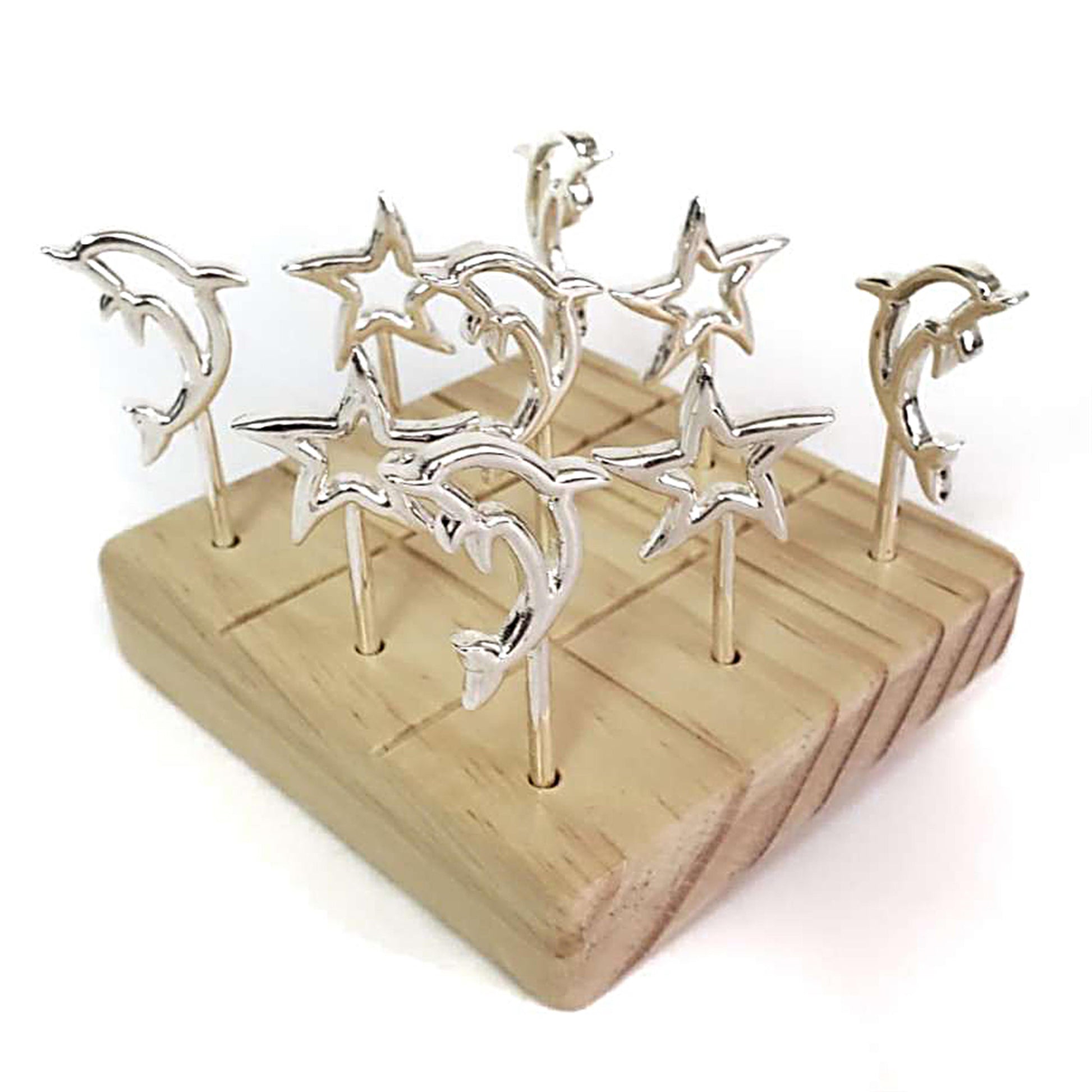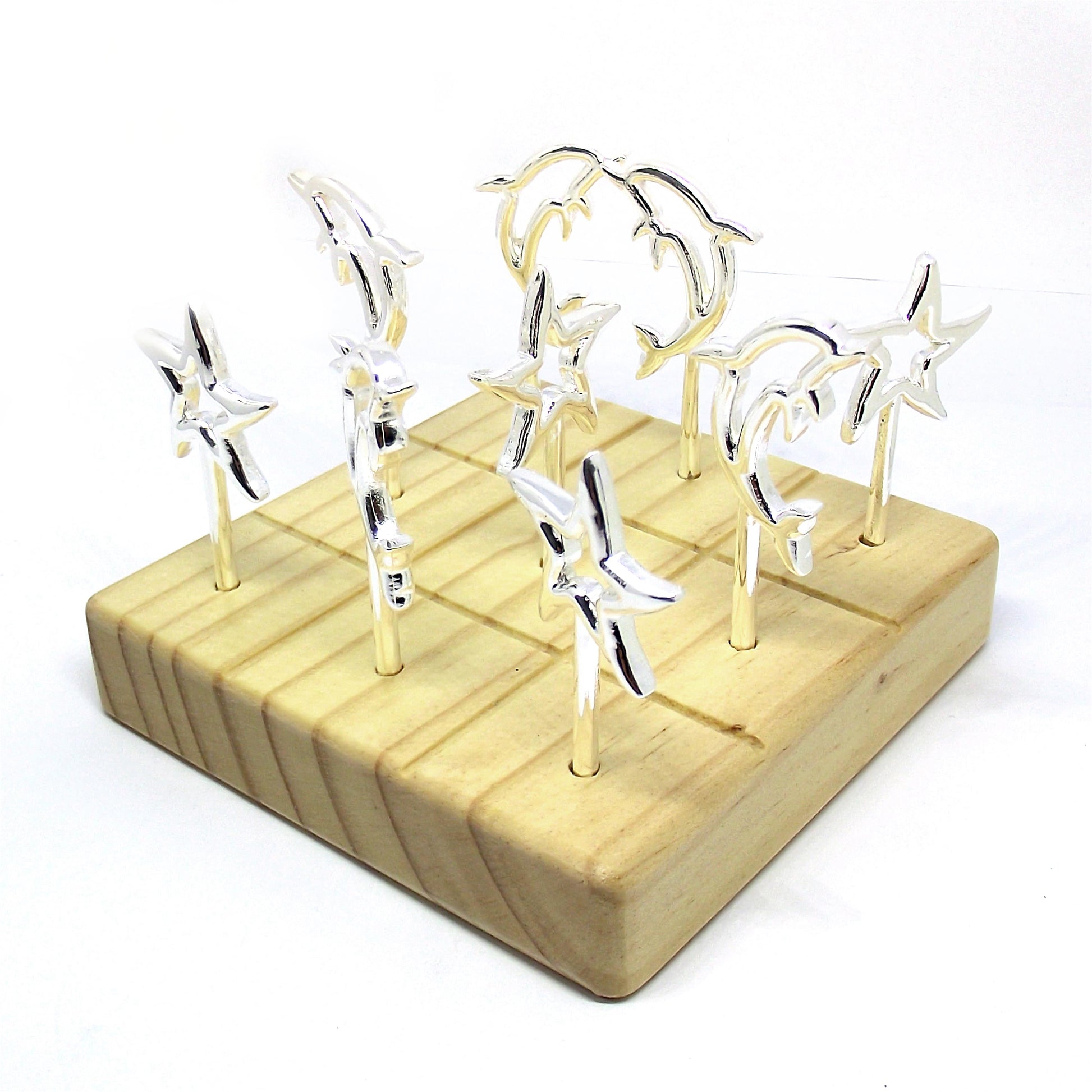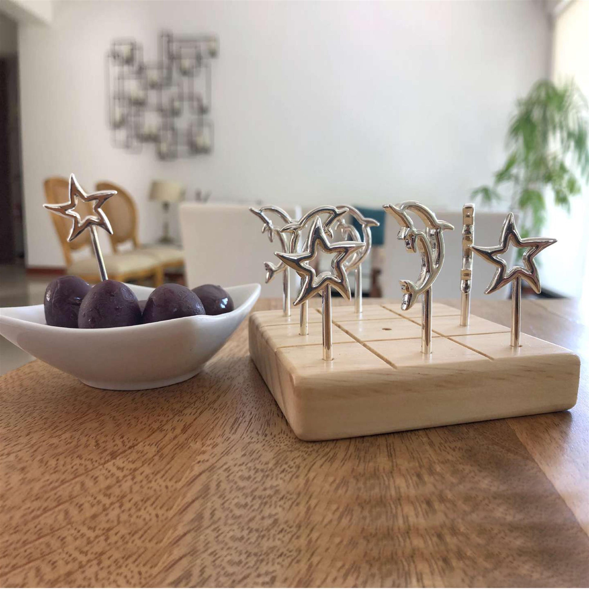 Súper prácticos y elegantes trinches en peltre. Vienen en juego de 9 unidades. Adempas puedes jugar 3 en Raya con la base de madera. Ideal para tus piqueos, decorar tu mesa y para regalar a tus personas especiales.