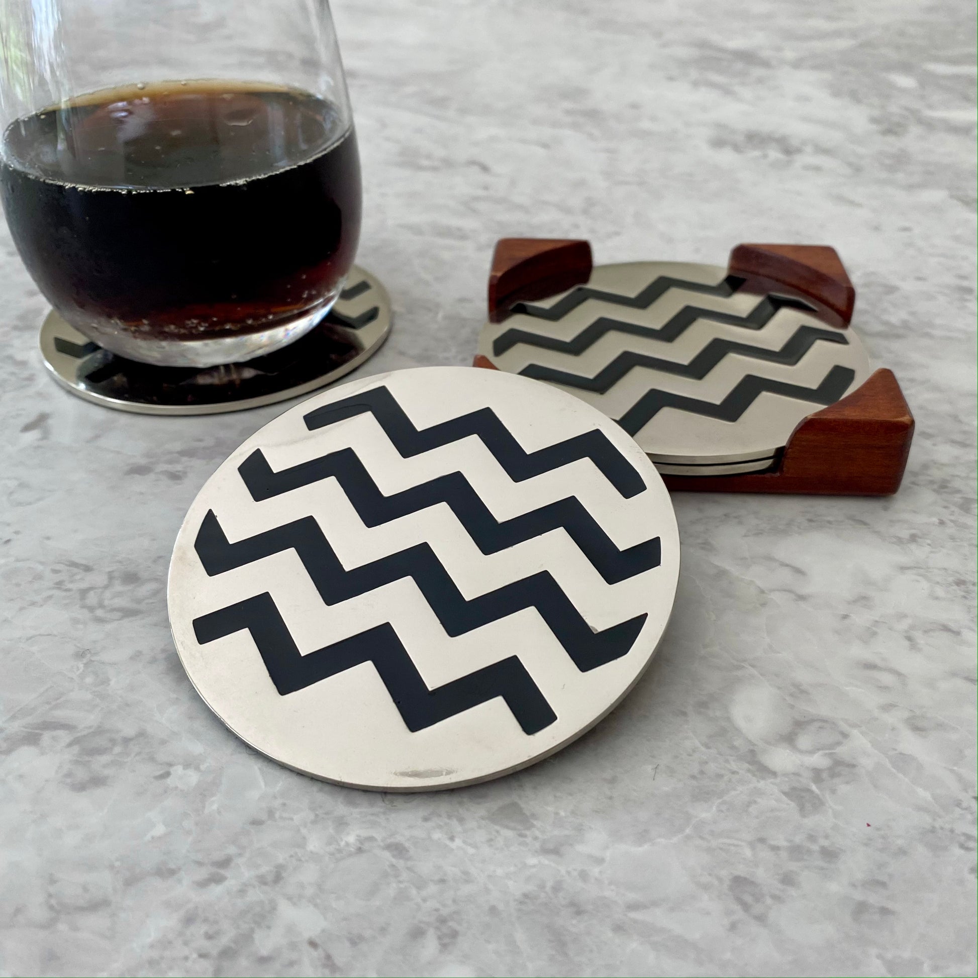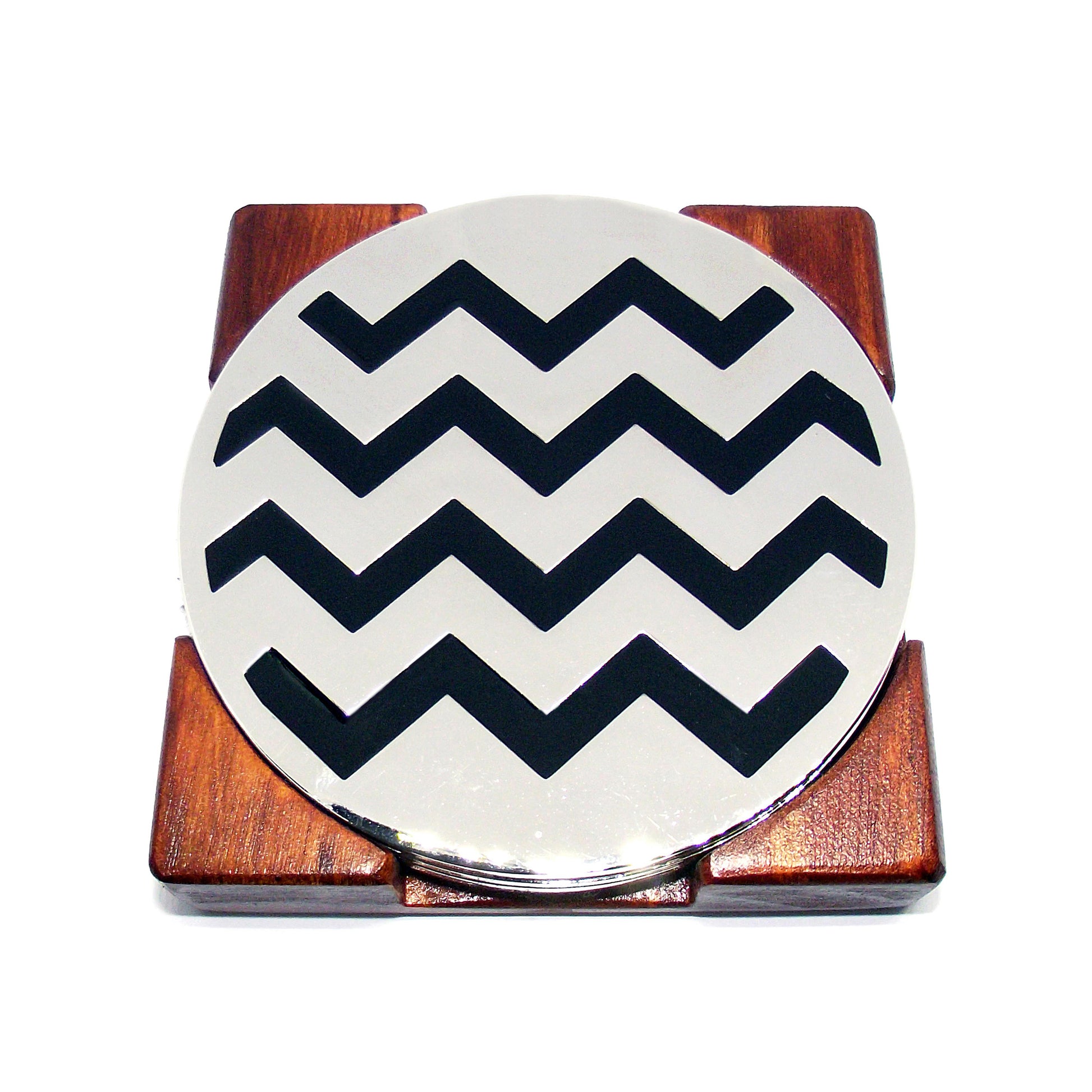 Lindos y elegantes posavasos metálicos. Vienen en juego de 4 unidades, con base de madera para guardarlos. Ideales a para decorar tu mesa y para regalar a tus personas especiales.
